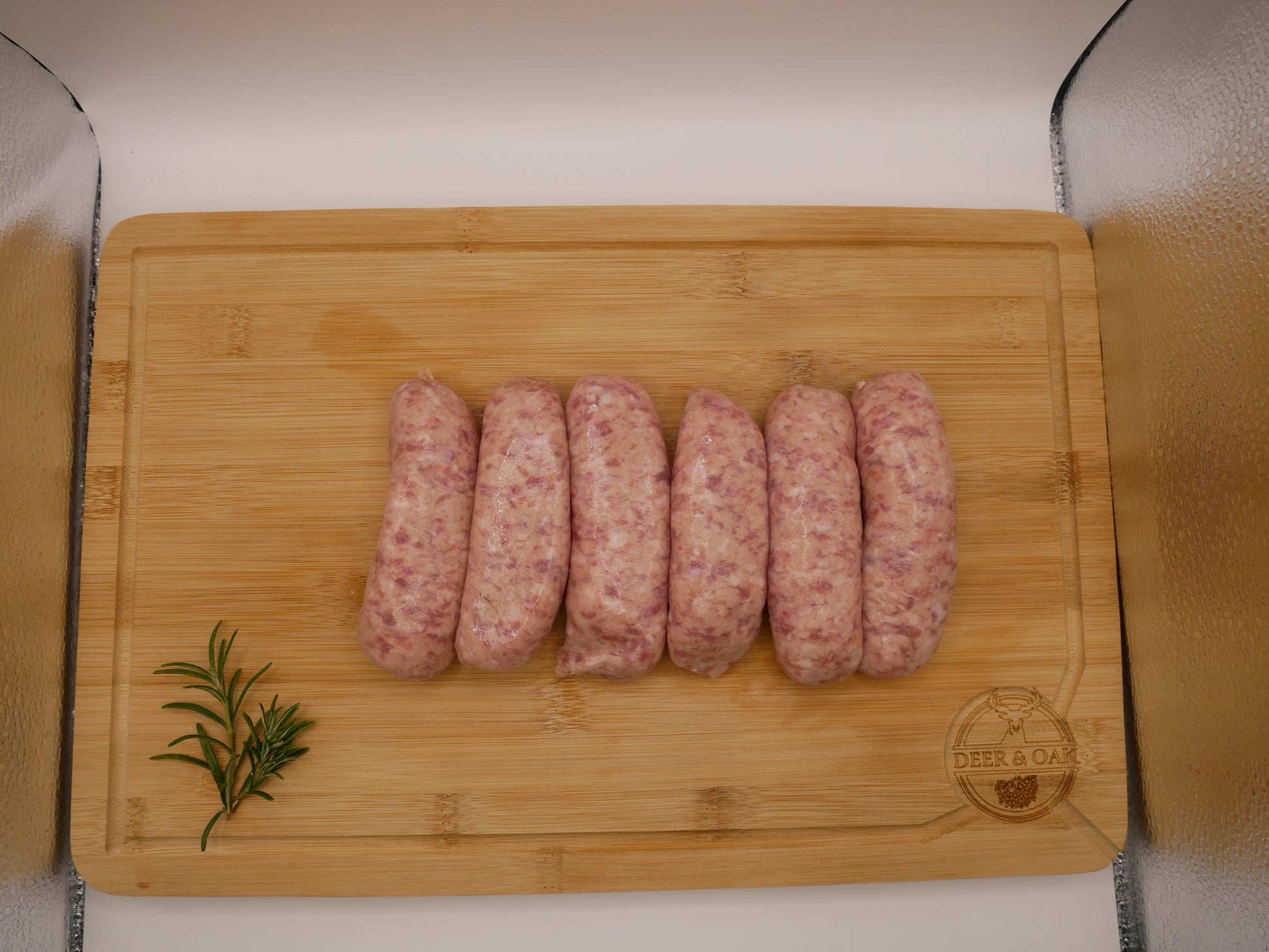 Contains Pork 80% Ingredients: Pork, Rusk (Wheat, Flour, ;Gluten), Water, Salt, Sugar, Stabiliser(E451) Dextrose, Flavouring, Preservative (E221) (Sulphite), Antioxidant(E300), Spice Extract, Anticakind Agent(E551), Honey Powder, Colour(E120), Natural Hog Skins. This Product Must Be Thoroughly Cooked |